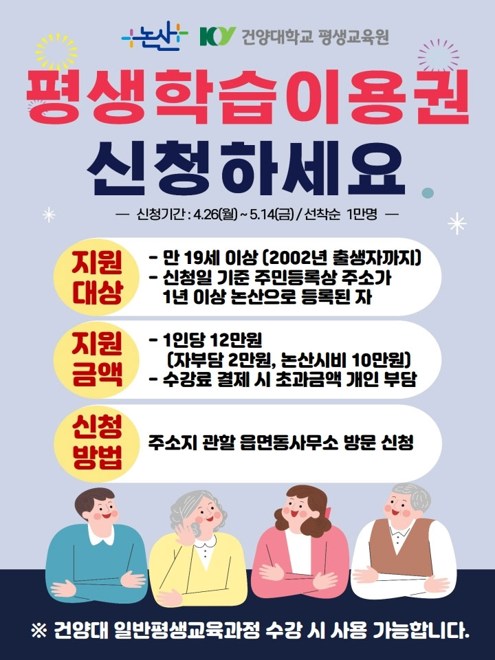 논산시-건양대학교 평생학습 이용권 신청 안내입니다. 건양대학교 평생교육원에서 운영하는 일반평생교육 과정 수강 시 이용가능합니다!