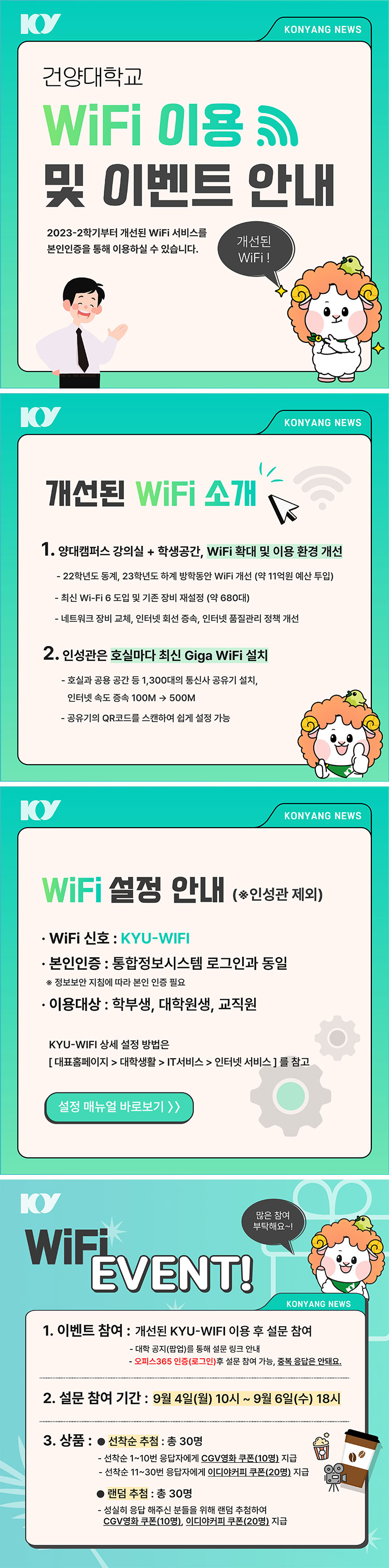 『 건양대학교 WiFi 이용 및 이벤트 안내 』글의 상세내용을 확인하는 표로 제목, 부서명, 등록일, 조회, 첨부, 내용으로 나뉘어 설명합니다.