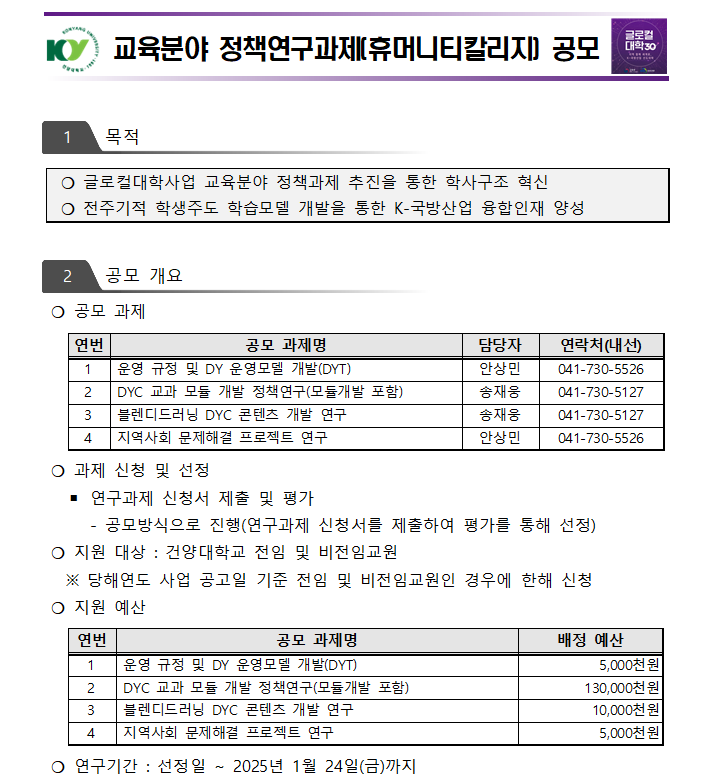 | 제목 | [글로컬대학사업] 교육분야 정책연구과제(휴머니티칼리지) 공고 | ||||