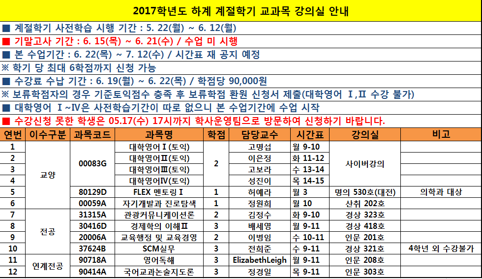 | 제목 | 2017학년도 하계 계절학기 교과목 강의실 안내 | ||||