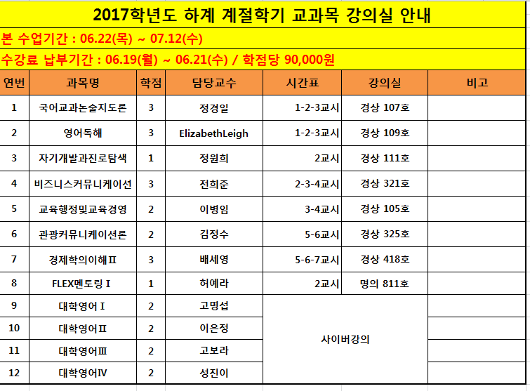 | 제목 | 2017학년도 하계 계절학기 강의실 및 수납안내 | ||||