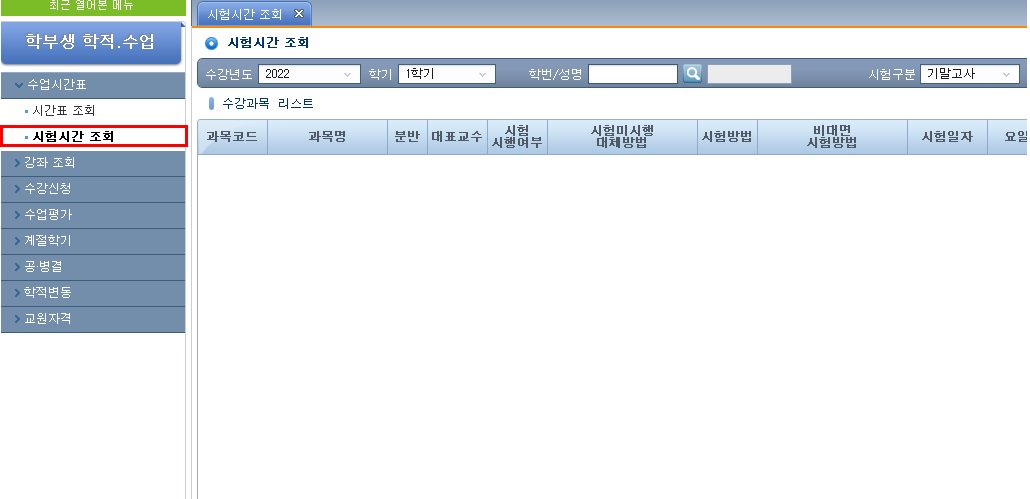 2. 교과목별 시험시간표 확인 방법 가. 확인경로 : 통합정보시스템 로그인 → 학적.수업 → 수업시간표 → 시험시간 조회