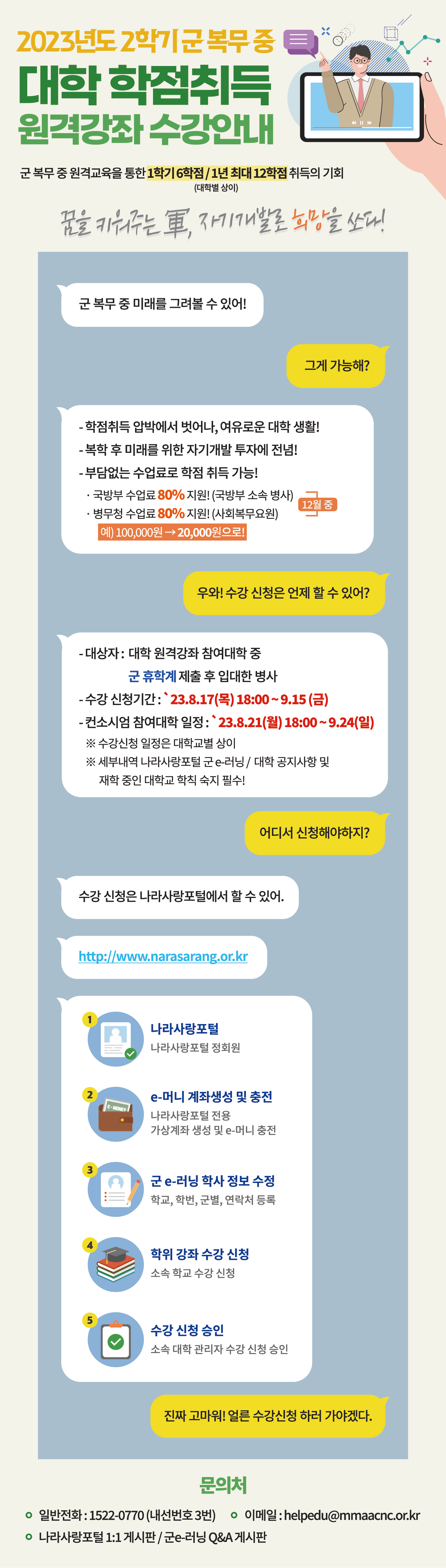 | 제목 | 2023-2학기 군 복무중 학점취득(군e러닝) 원격강좌 수강 안내 | ||||