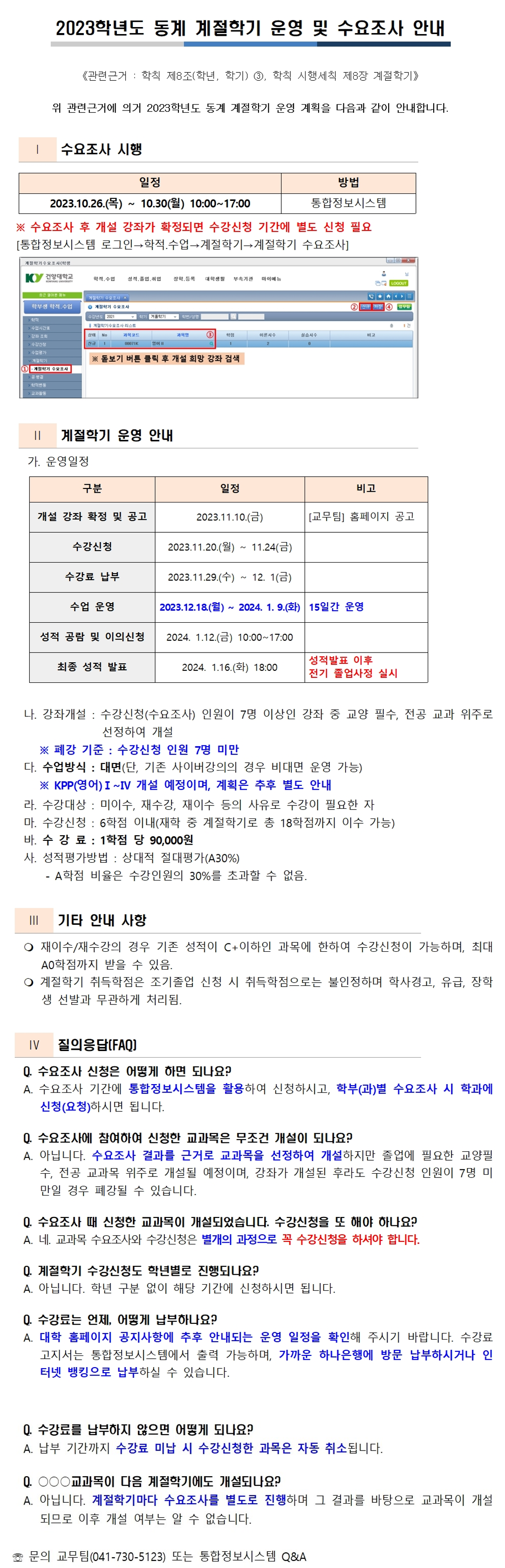 | 제목 | 2023학년도 동계 계절학기 운영 및 수요조사 안내 | ||||