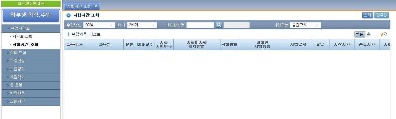● 유의사항 1) 수강 중인 과목 중 시험 일정이 확정된 과목만 조회됩니다. 2) 조회 되지 않는 과목에 대해서는 담당 교수님께 개별 문의 바랍니다. 3) 시험 일정 및 고사장은 중간에 변경될 수 있으므로 시험 응시 전 최종 확인 바랍니다. 4) 학점교류 교과목은 교류기관별 시험일정을 확인해 주시기 바랍니다.