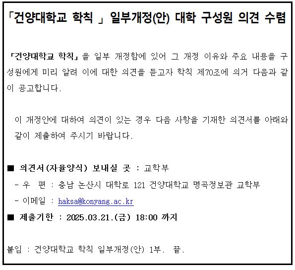 | 제목 | 「건양대학교 학칙 」개정(안) 대학 구성원 의견수렴 | ||||