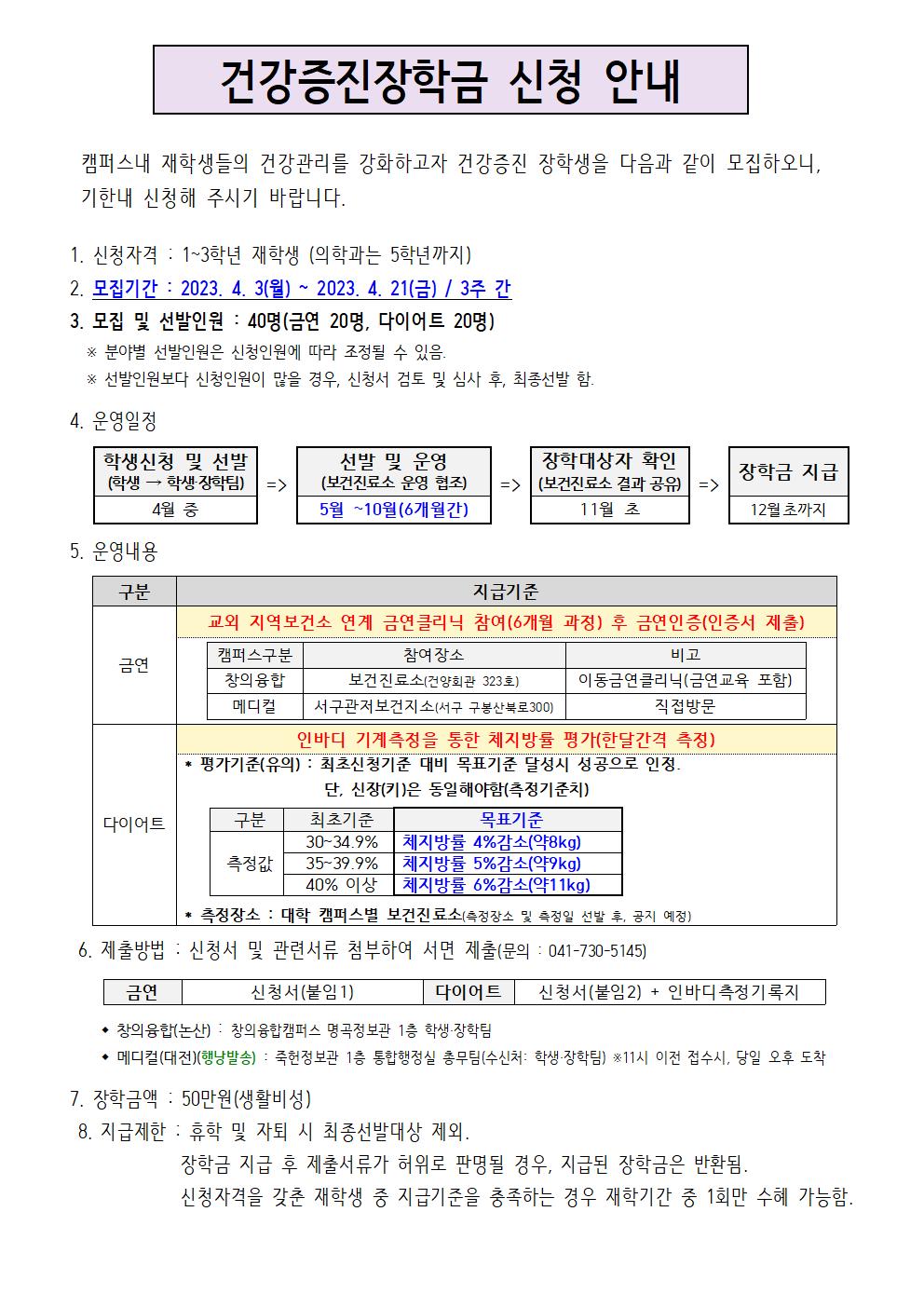 | 제목 | 2023학년도 건강증진장학금(금연, 다이어트) 선발 및 신청안내 | ||||