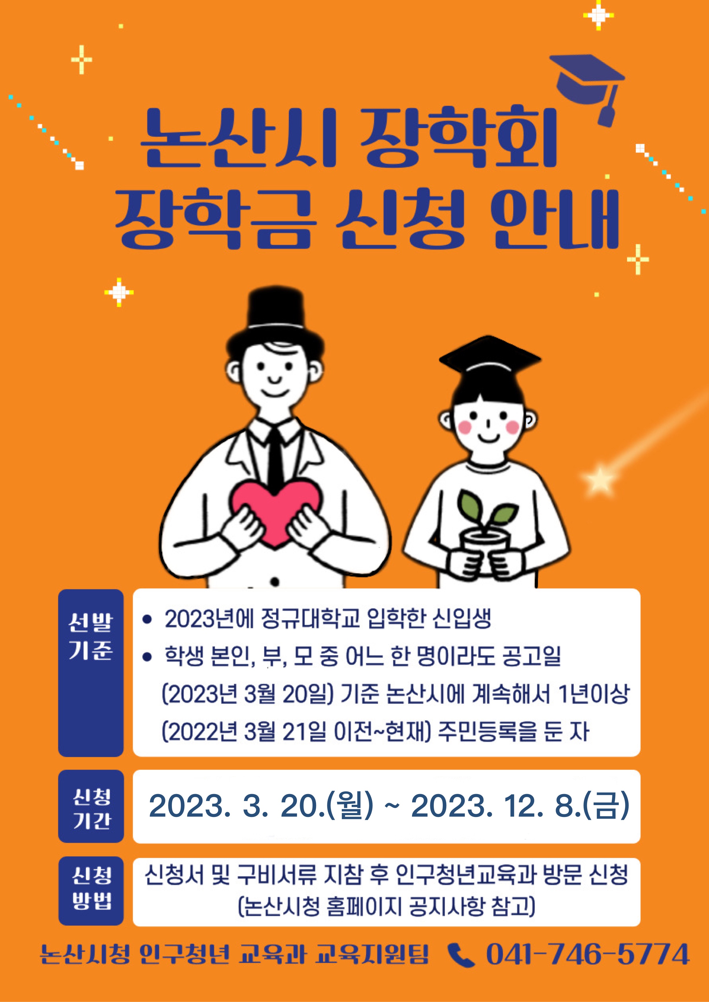 | 제목 | ★ 2023년 논산시장학회 학업장려장학생 선발안내(~12.8까지) | ||||