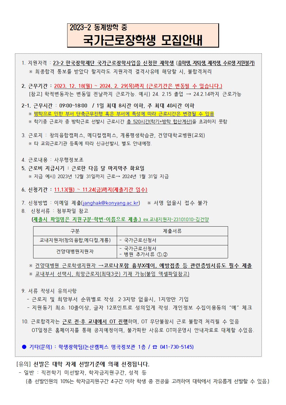 『 ★11.13~11.24까지★ 23년 동계방학중 국가근로장학생 모집안내(교내,건양대병원) 』글의 상세내용을 확인하는 표로 제목, 부서명, 등록일, 조회, 첨부, 내용으로 나뉘어 설명합니다.