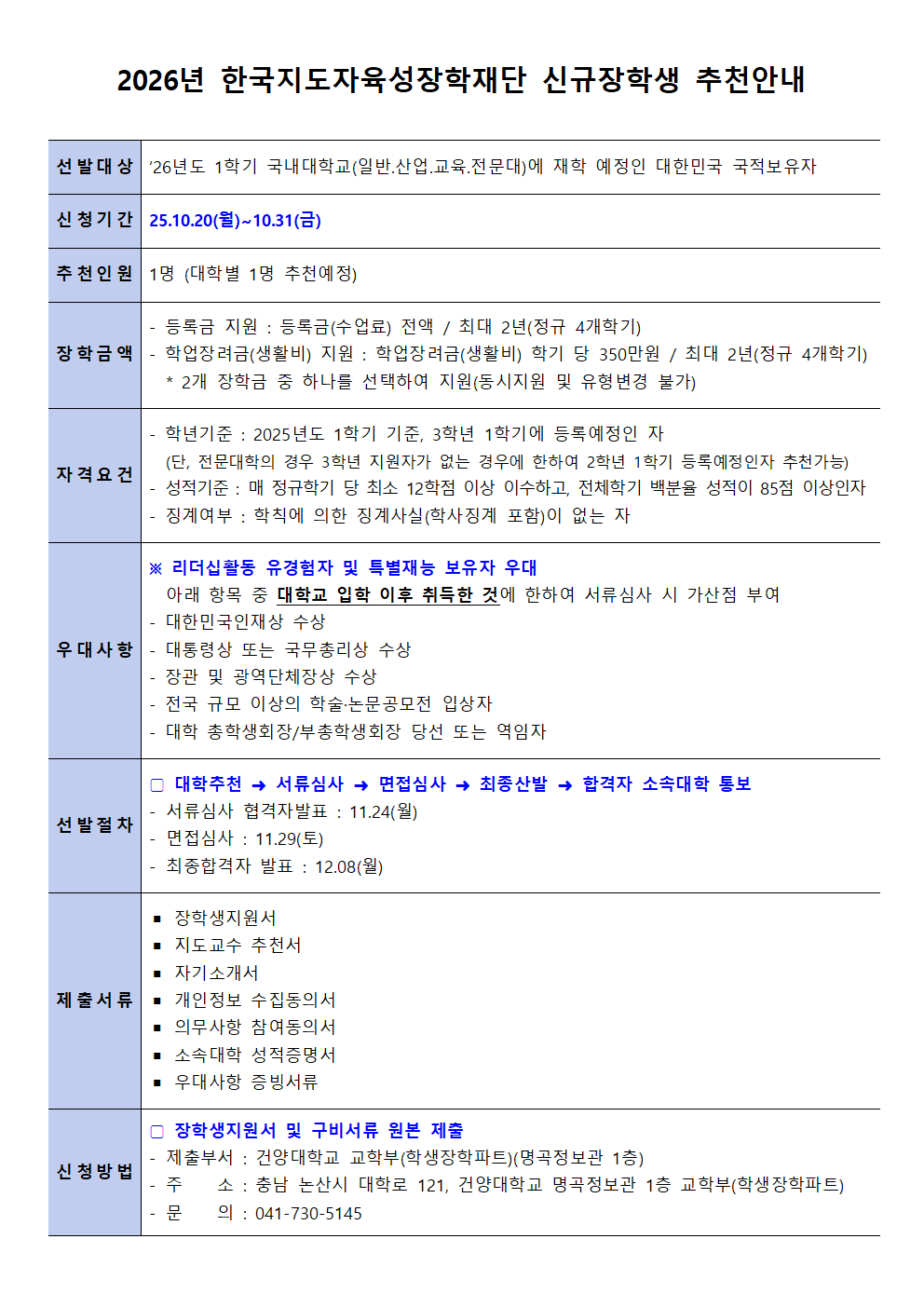 | 제목 | 2026년 한국지도자육성장학재단 신규장학생 신청안내 | ||||