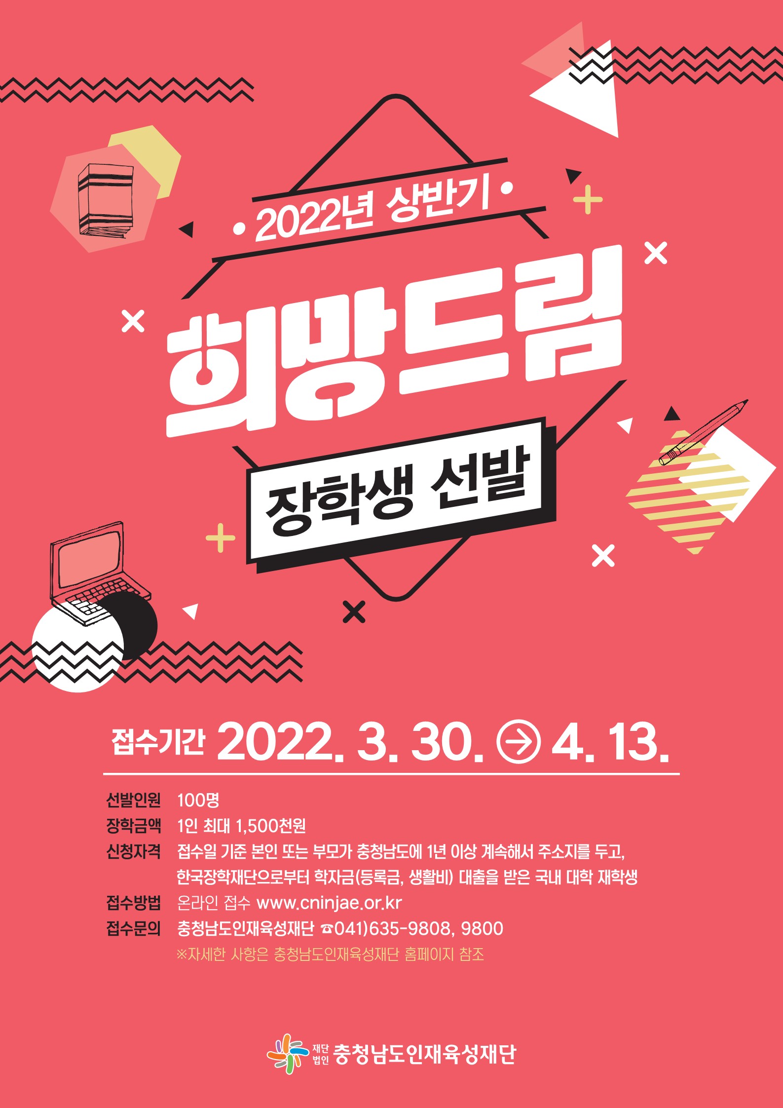 | 제목 | 2022년도 상반기 충청남도인재육성재단 "희망드림 장학생" 선발 안내 | ||||