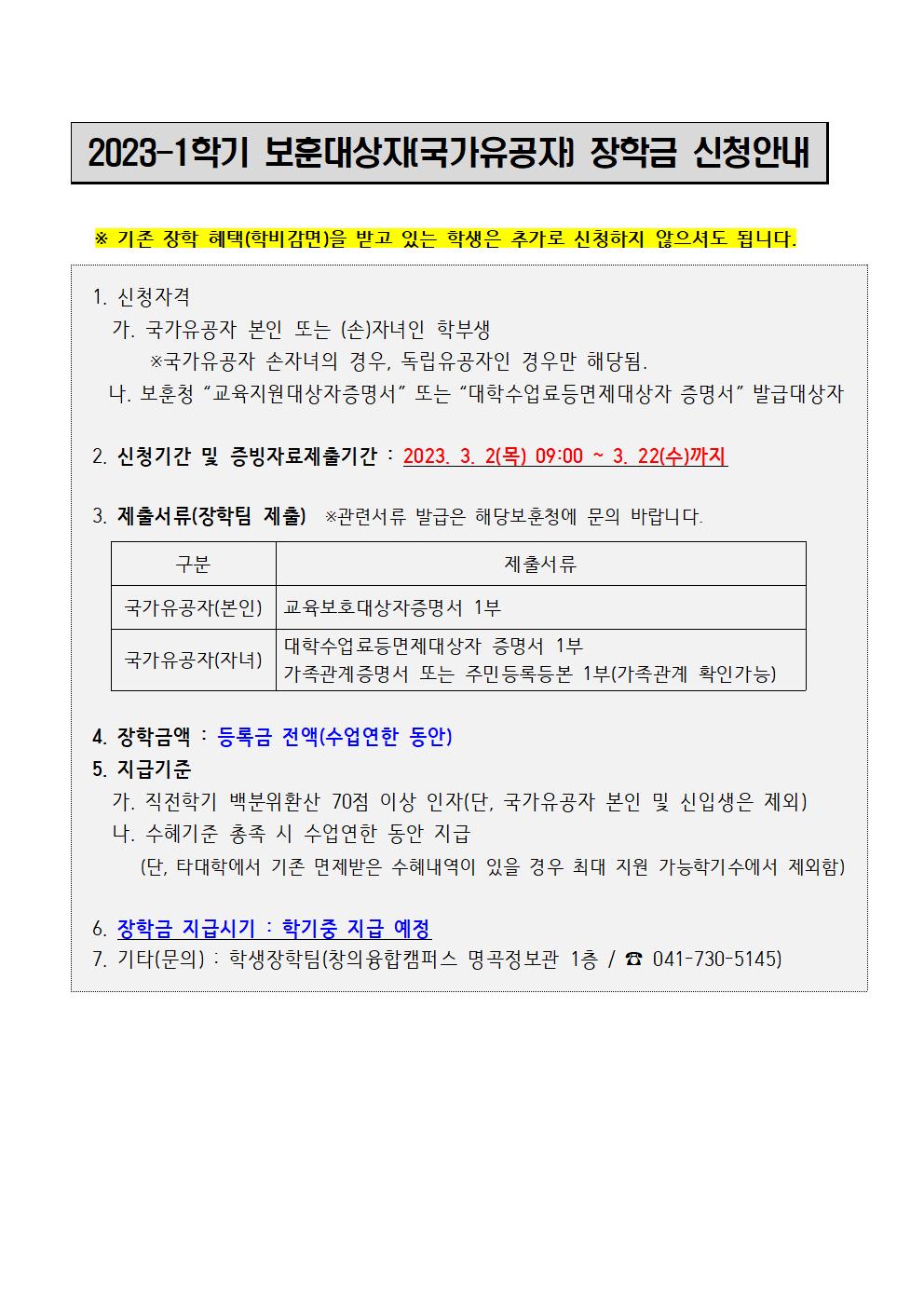 | 제목 | 2023-1학기 대학 보훈대상자(국가유공자) 장학금 신청안내(신규자) | ||||