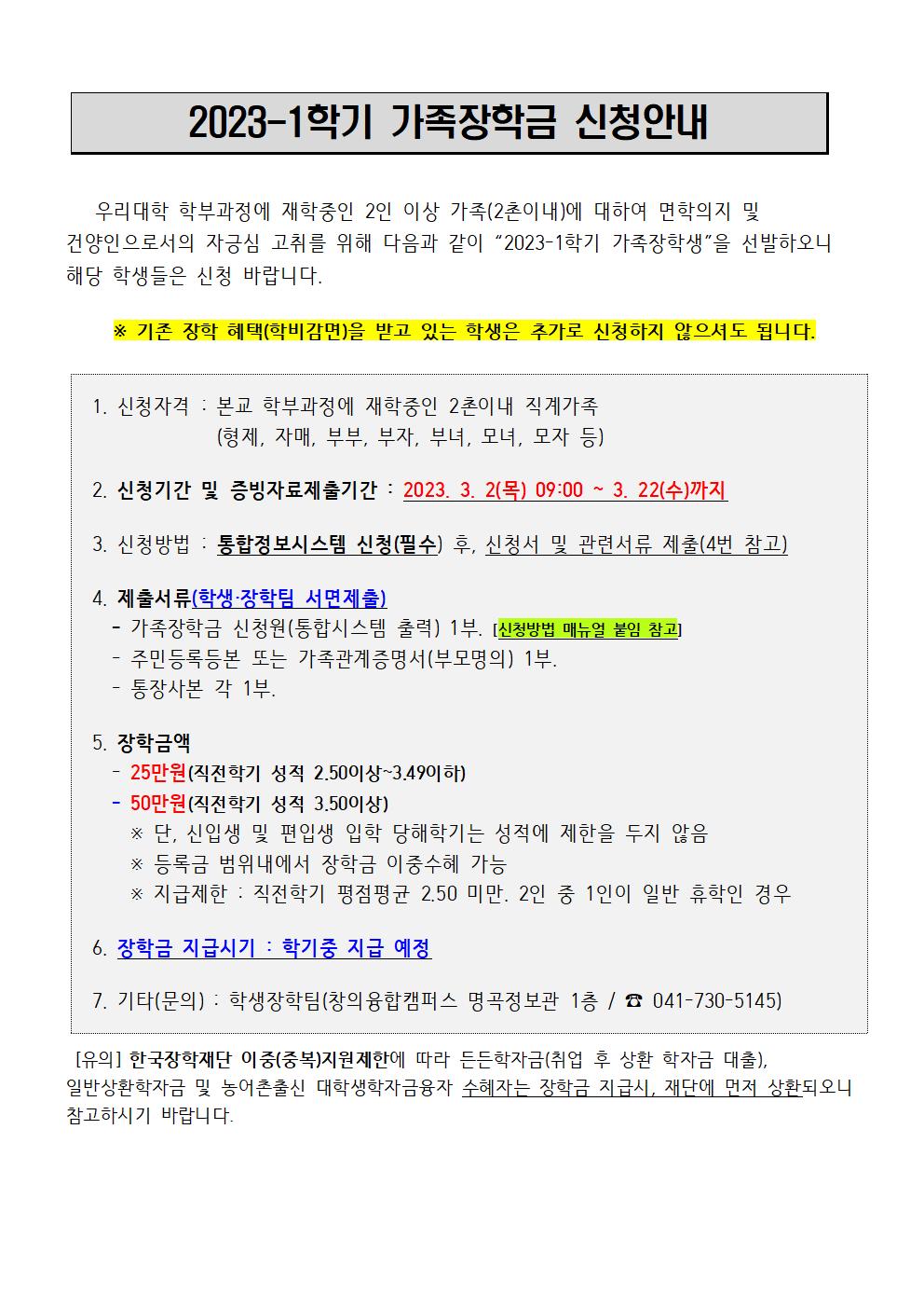 | 제목 | 2023-1학기 가족장학금 신청 안내(신규자) | ||||