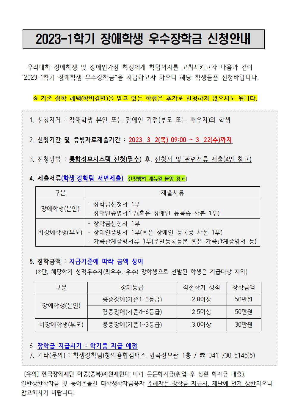 | 제목 | 2023-1학기 장애학생우수장학금 신청 안내(신규자) | ||||