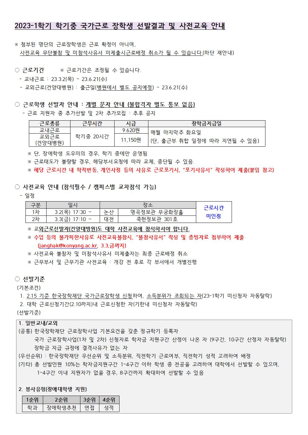 『 (수정)23-1학기 학기 중 국가근로장학생 선발결과 및 사전교육안내(양식첨부) 』글의 상세내용을 확인하는 표로 제목, 부서명, 등록일, 조회, 첨부, 내용으로 나뉘어 설명합니다.