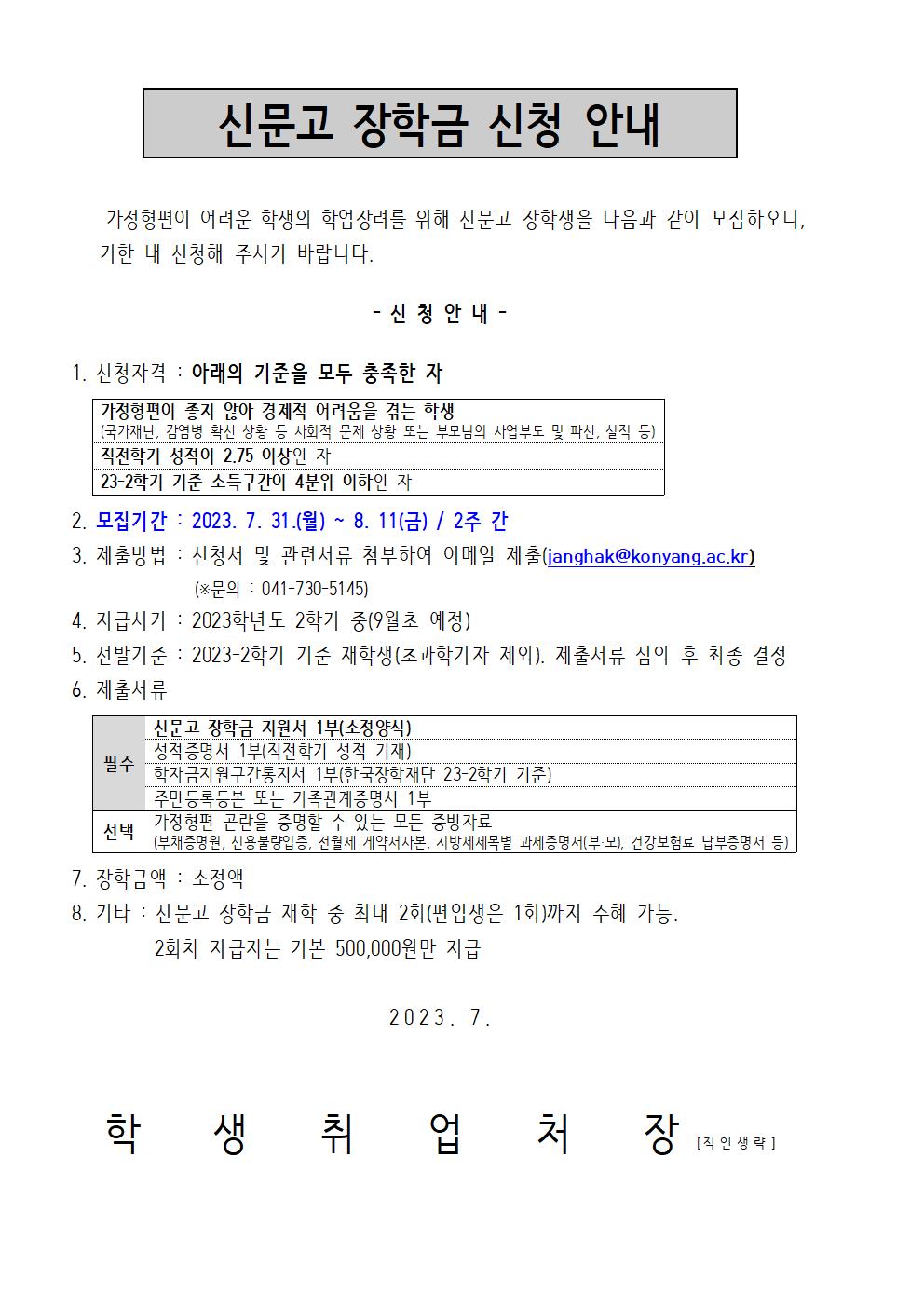 | 제목 | ★7.31~8.11까지★ 23-2학기 신문고 장학금 신청안내 | ||||