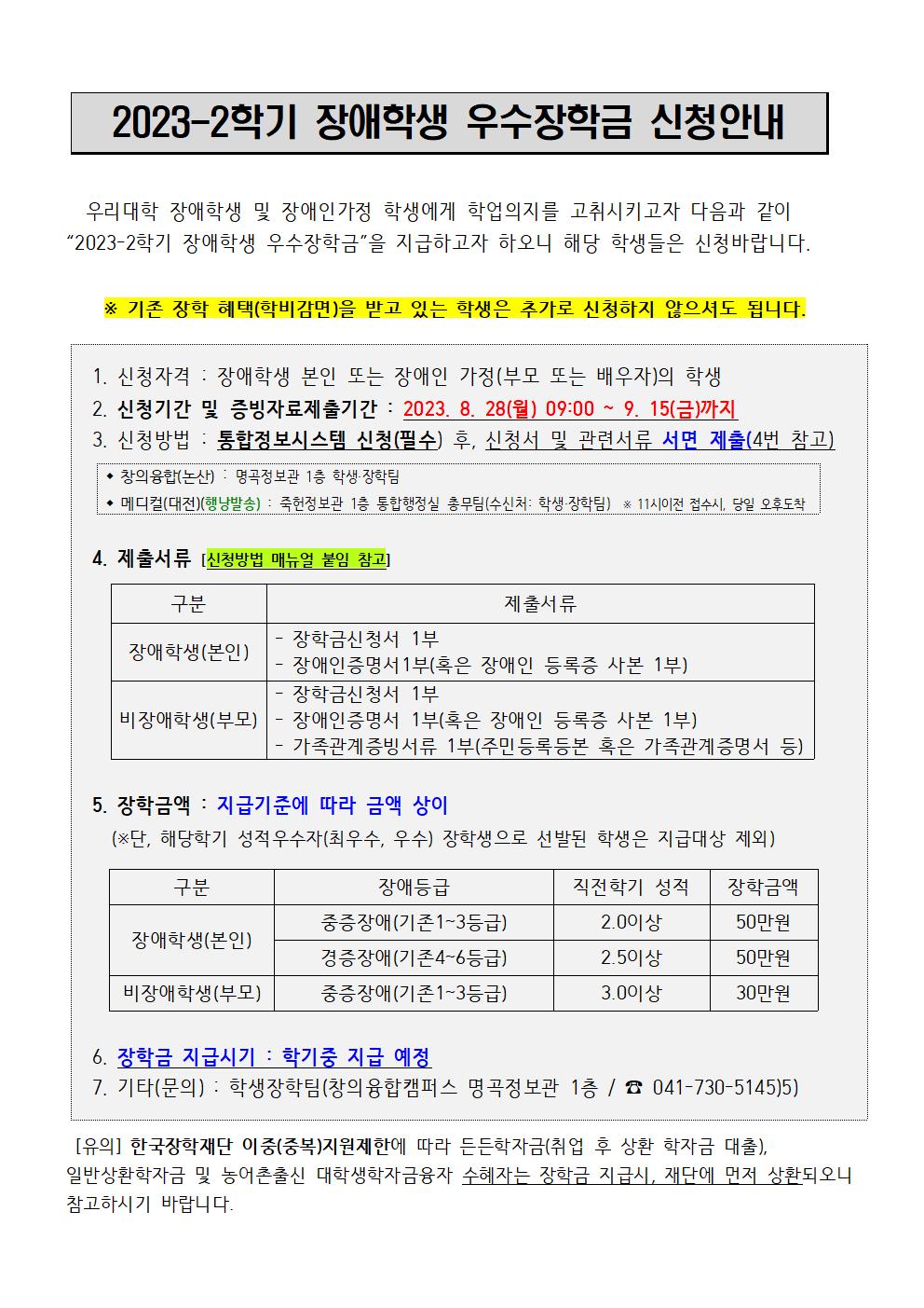 | 제목 | ★8.28~9.15까지★2023-2학기 장애학생우수장학금 신청 안내(신규자) | ||||