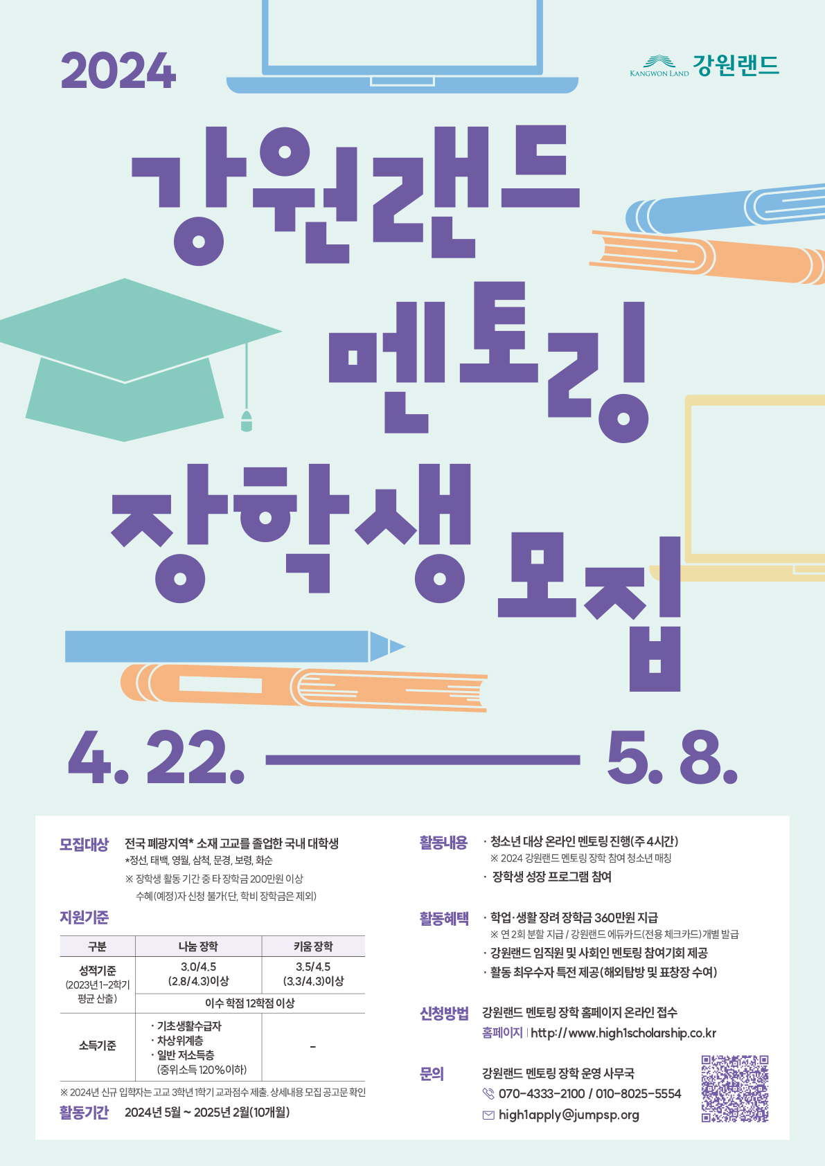 | 제목 | 2024 강원랜드 멘토링 장학생 모집 | ||||