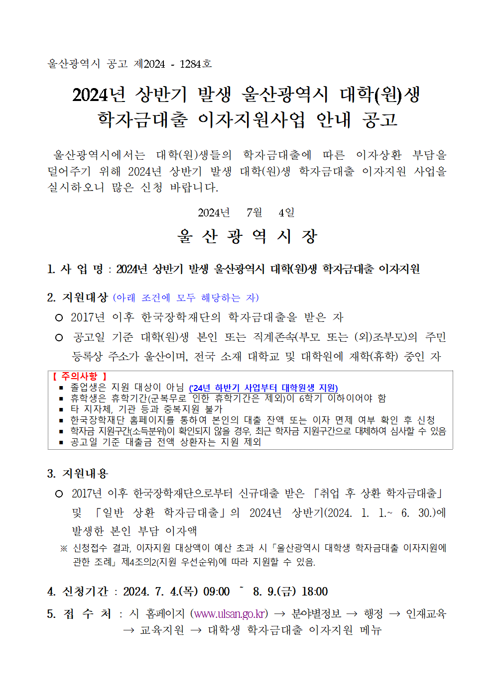 2024년_상반기_발생_울산광역시_대학(원)생_학자금대출_이자지원사업_공고문.hwp
