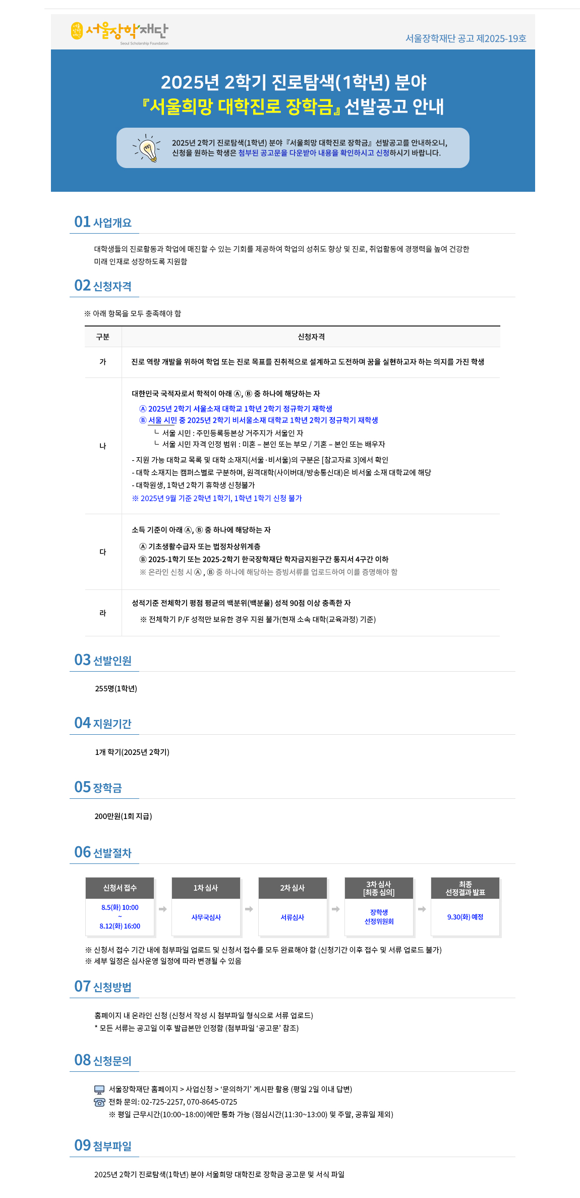 『 [서울장학재단] 2025년 2학기 진로탐색(1학년) 분야 '서울희망 대학진로 장학금' 선발공고 안내 』글의 상세내용을 확인하는 표로 제목, 부서명, 등록일, 조회, 첨부, 내용으로 나뉘어 설명합니다.