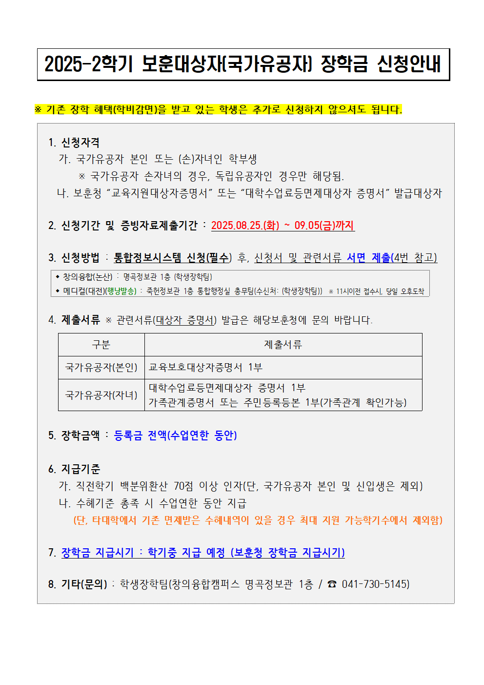 | 제목 | 2025-2학기 보훈장학금(신규자) 신청안내 | ||||