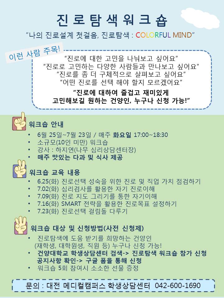 학생상담센터에서는 "진로", "대인관계"의 도움을 필요로 하는 건양인들을 위해 워크숍 및 집단상담 프로그램을 준비하였습니다. 캠퍼스별 프로그램 내용을 확인하시고 적극 참여하시어 큰 도움이 되길 바랍니다.
