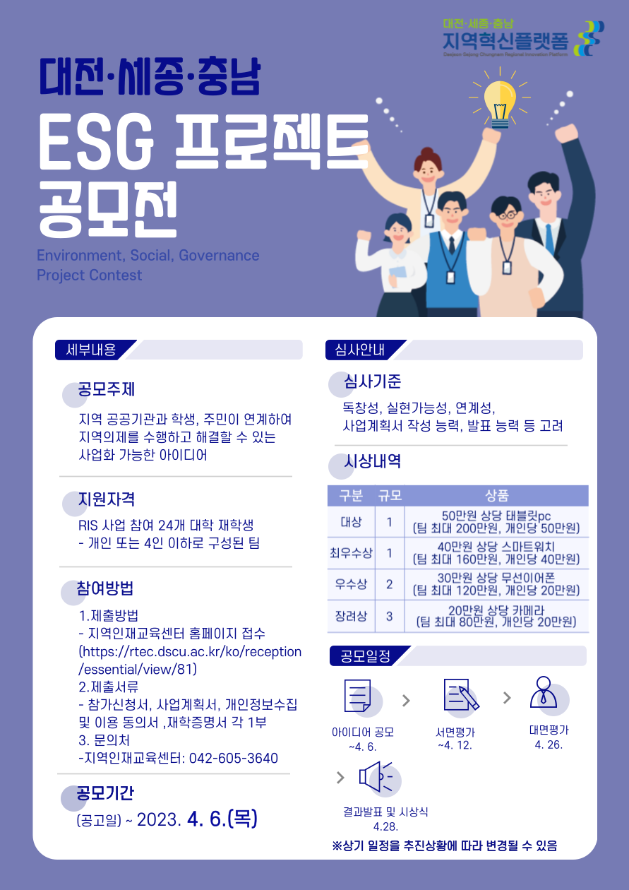 | 제목 | 대전·세종·충남 ESG 프로젝트 공모전 안내 | ||||