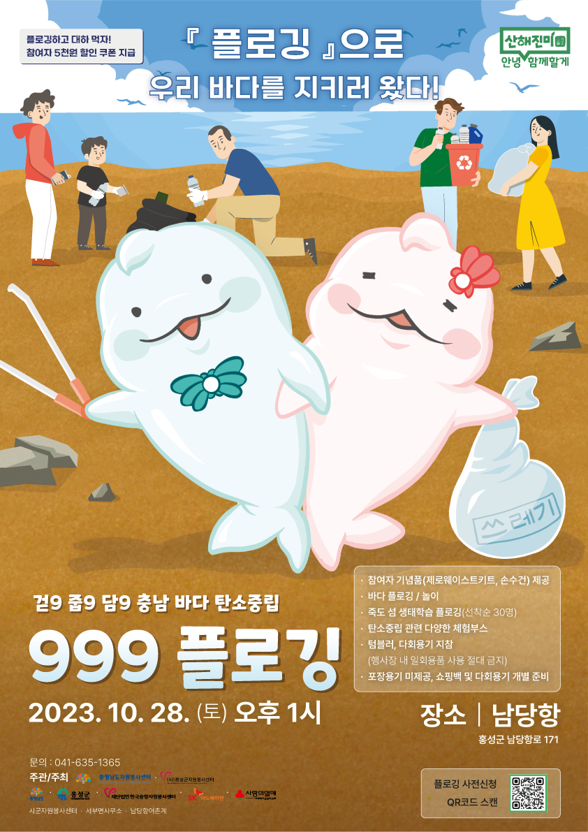 가. 사 업 명 : 걷9, 줍9, 담9 충남 바다 탄소중립‘999 플로깅’ 나. 일 시 : 2023. 10. 28.(토) 13:00 ~ 17:00 다. 장 소 : 충남 홍성군 서부면 남당항로 171(남당항 일원) 라. 내 용 ○ 해변 플로깅, 탄소중립 관련 체험부스 운영 ○ 다양한 콘테스트 이벤트(기프티콘 경품 제공 등) 및 플로깅 미션 수행 ○ 플로깅 참여자 대하 할인 쿠폰, 네트어드벤처 할인 쿠폰 제공 마. 신청방법 : 1365자원봉사포털(https://url.kr/erv8wt) / 포스터 QR코드 접속 바. 기 타 : 홍보영상(https://url.kr/xkd4ah) / 모바일리플렛(https://o3o.us/999Plogging/2310020) 사. 문 의 : 충청남도자원봉사센터(041-635-1365, 사업교육팀)