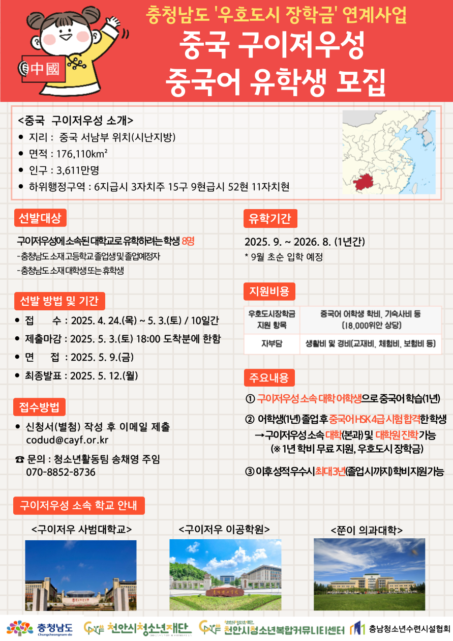 다. 모집대상: 중국 구이저구성 소속 대학교로 유학하려는 학생 ※ (필수) 충남지역 고등학교 졸업생 및 졸업예정자, 충남지역 대학생 또는 휴학생