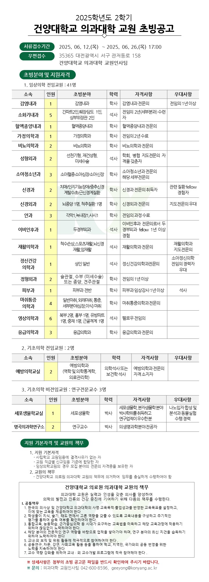 | 제목 | 2025학년도 2학기 건양대학교 의과대학 교원 초빙공고 | ||||