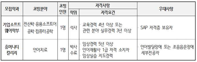 ■ 접수 : 온라인 접수 후 이메일 접수 ※ • 임용일자 : 2023.9.1부 • 온라인 접수(전임교원만 해당) : 2023.07.26(수) ~ 08.03(목) 12시 까지 ※ 위 기간에만 온라인 접수가 가능