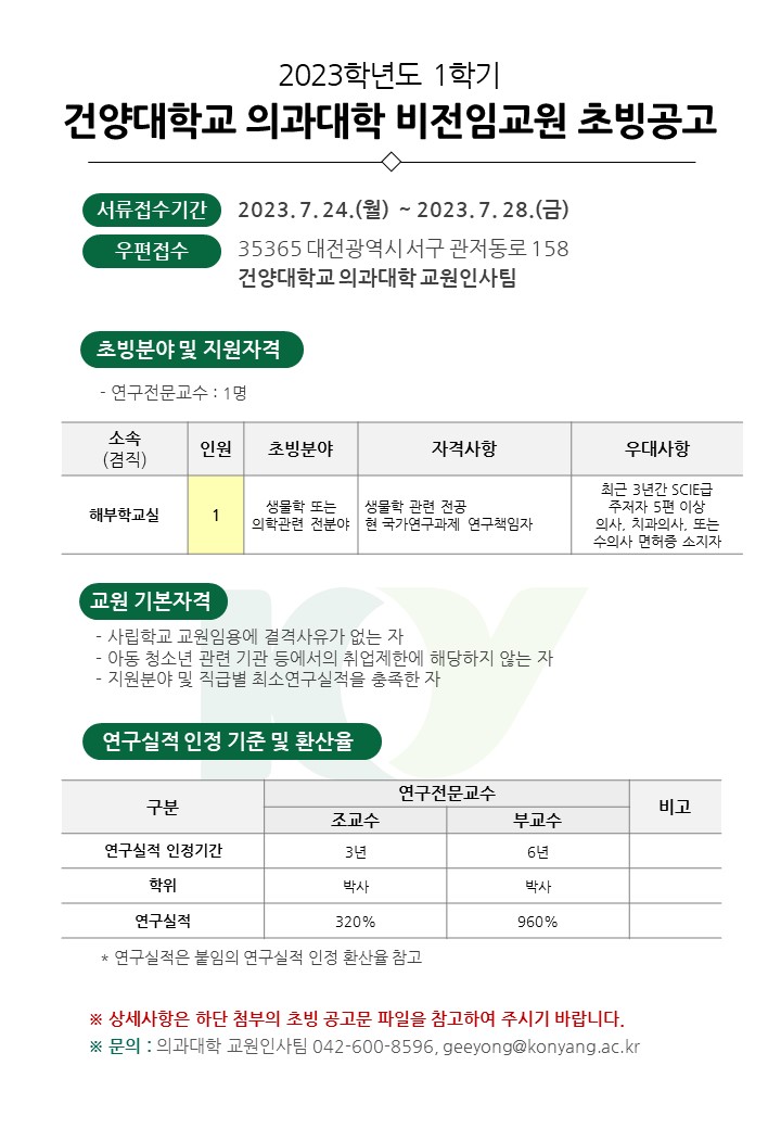 | 제목 | 2023학년도 2학기 건양대학교 의과대학 비전임교원 추가 초빙공고 | ||||