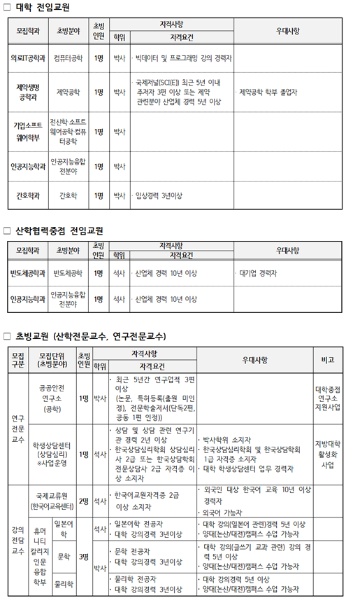 | 제목 | 2024학년도 1학기(2차) 건양대학교 교원 초빙 공고 | ||||