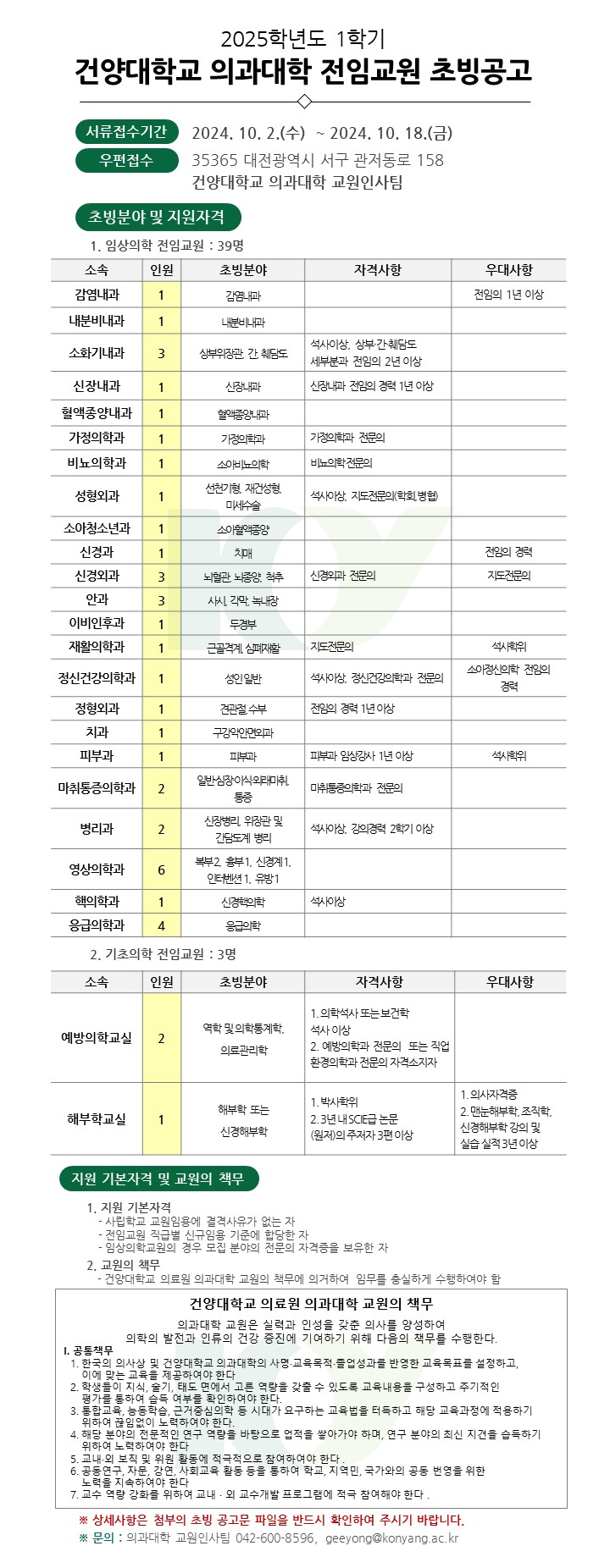 | 제목 | 2025학년도 1학기 건양대학교 의과대학 교원 초빙공고 | ||||