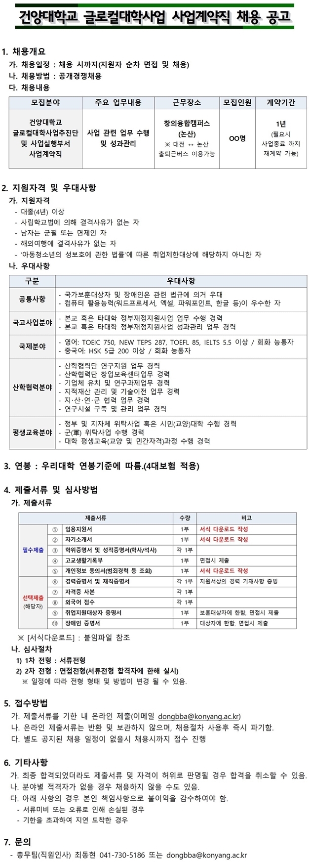 | 제목 | 건양대학교 글로컬대학사업 사업계약직 채용 공고 | ||||
