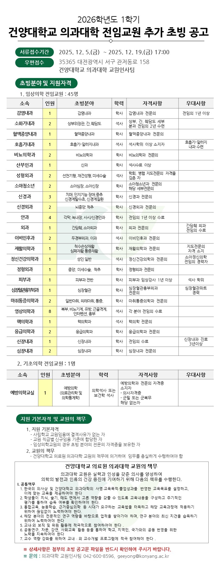 | 제목 | 2026학년도 1학기 건양대학교 의과대학 교원 추가 초빙 공고 | ||||