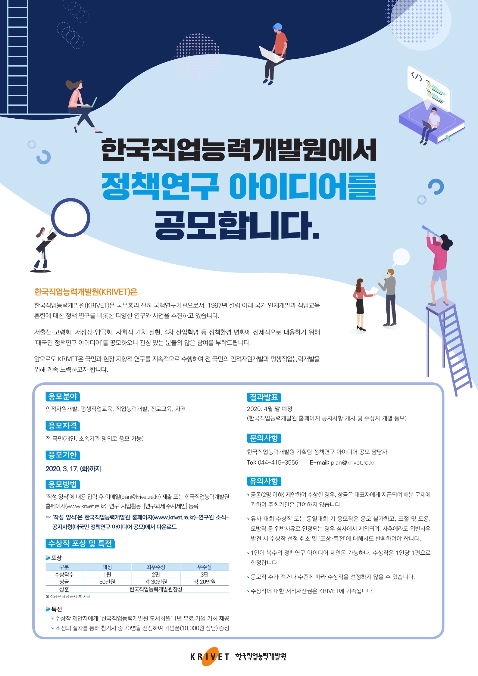 | 제목 | 2020년도 한국직업능력개발원 정책연구 아이디어 공모전 안내 | ||||
