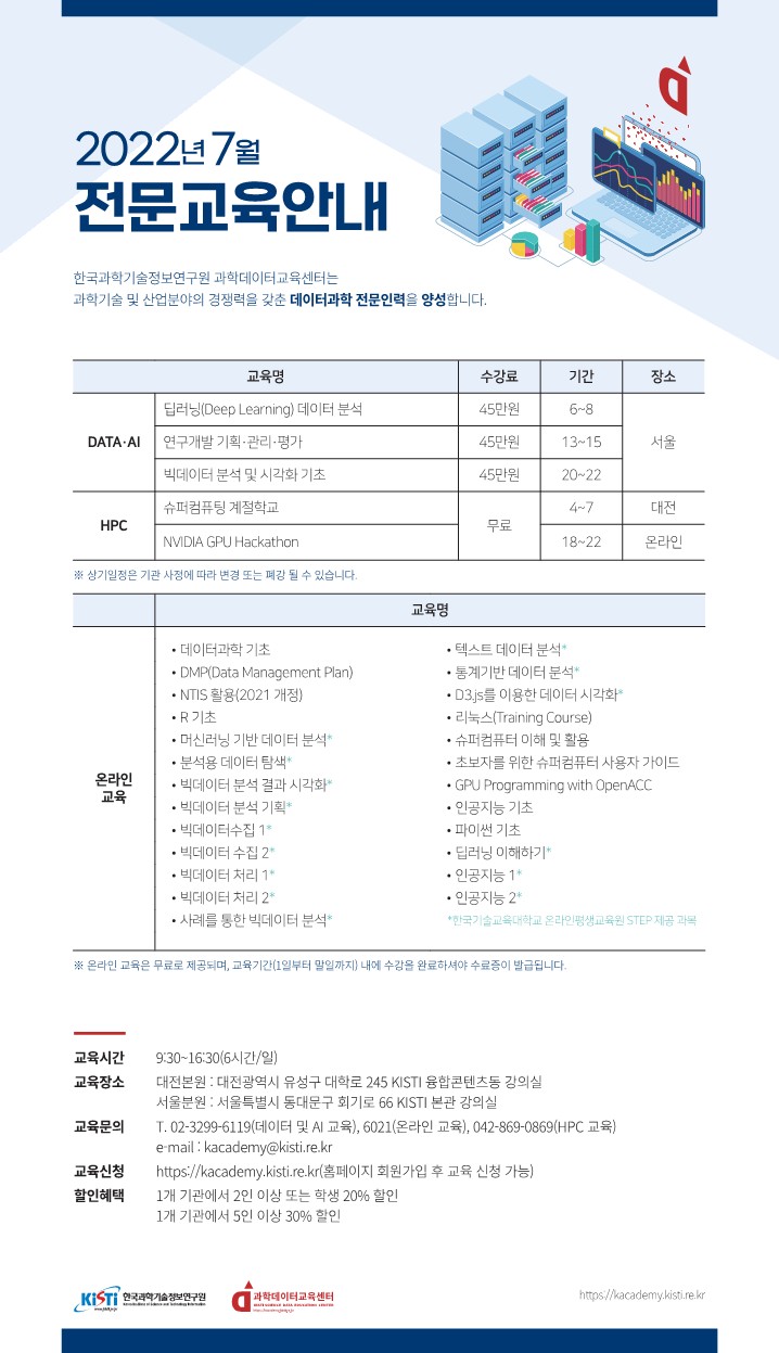 | 제목 | 한국과학기술정보연구원(KISTI) 2022년 7월 전문교육 운영 안내 | ||||