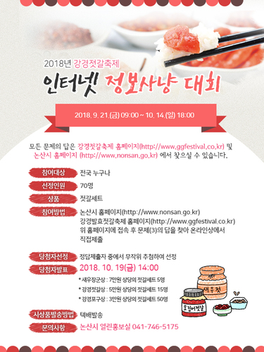 | 제목 | 2018년 강경젓갈축제 인터넷정보사냥대회 안내 | ||||