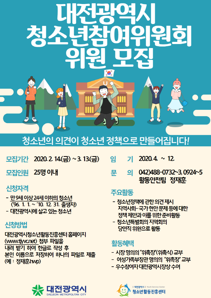 | 제목 | 2020 대전광역시 청소년 참여위원회 모집 | ||||