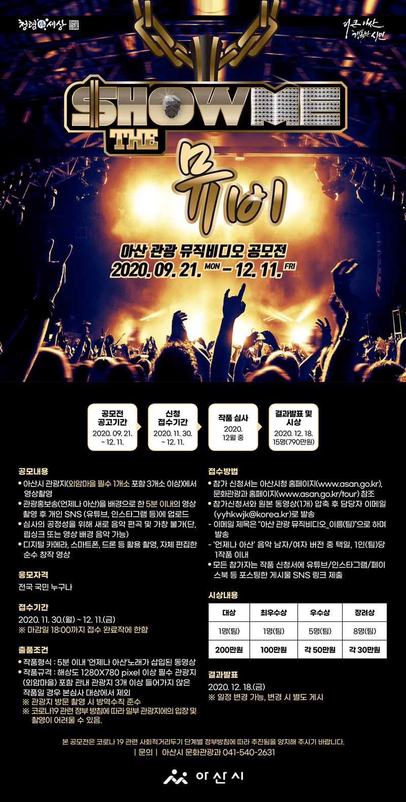 | 제목 | 2020 아산 관광 뮤직비디오 공모전 안내 | ||||