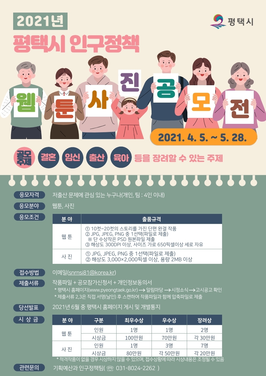 | 제목 | 2021년 평택시 인구정책 웹툰, 사진 공모전 안내 | ||||