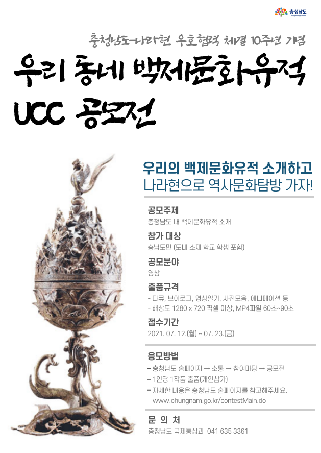 | 제목 | 충청남도-나라현 우호협력 10주년 기념 백제문화유적 UCC 공모전 안내 | ||||