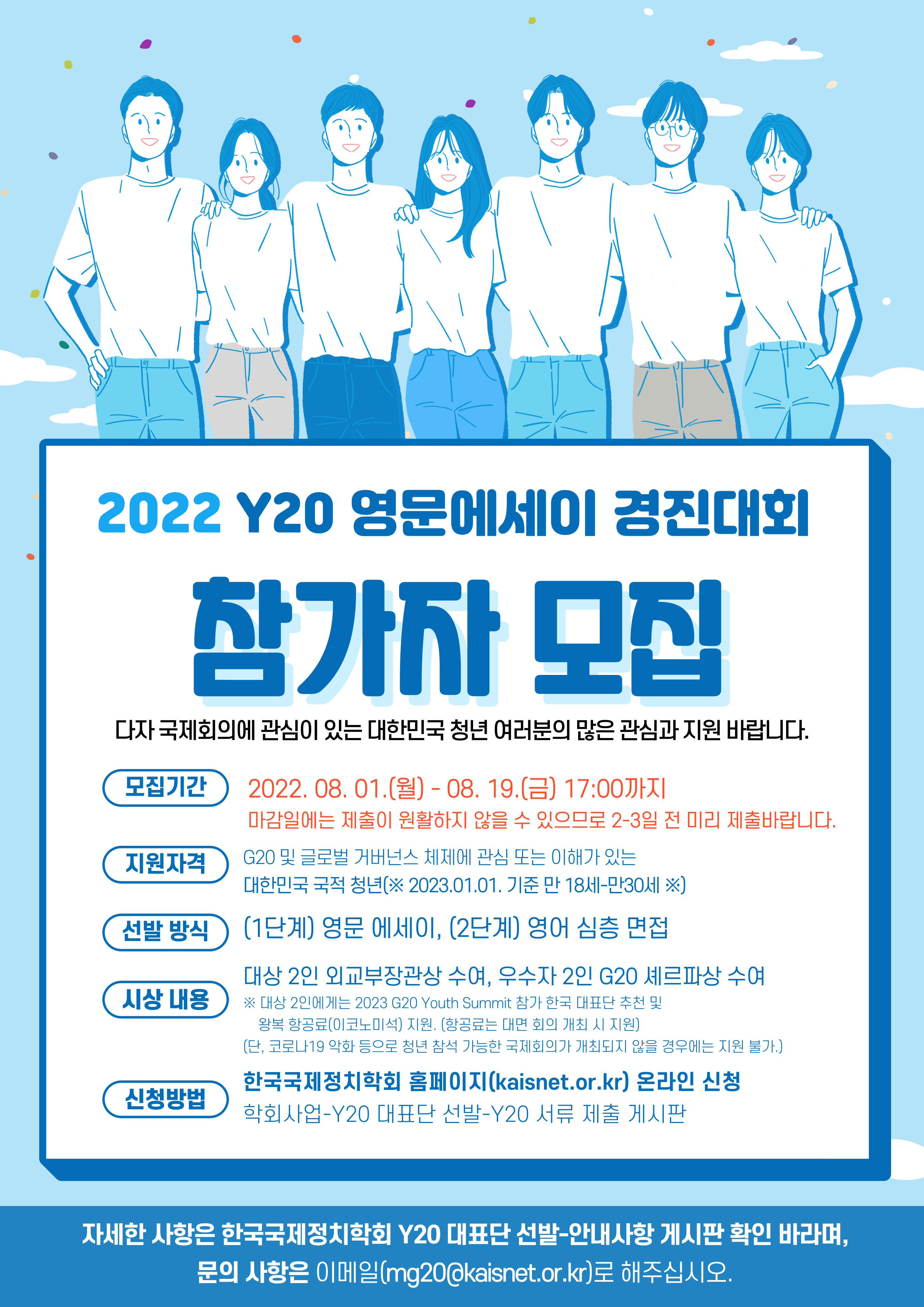 | 제목 | 2023 G20 Youth Summit(Y20) 참가 대표단 선발 공고(영문에세이 경진대회) | ||||