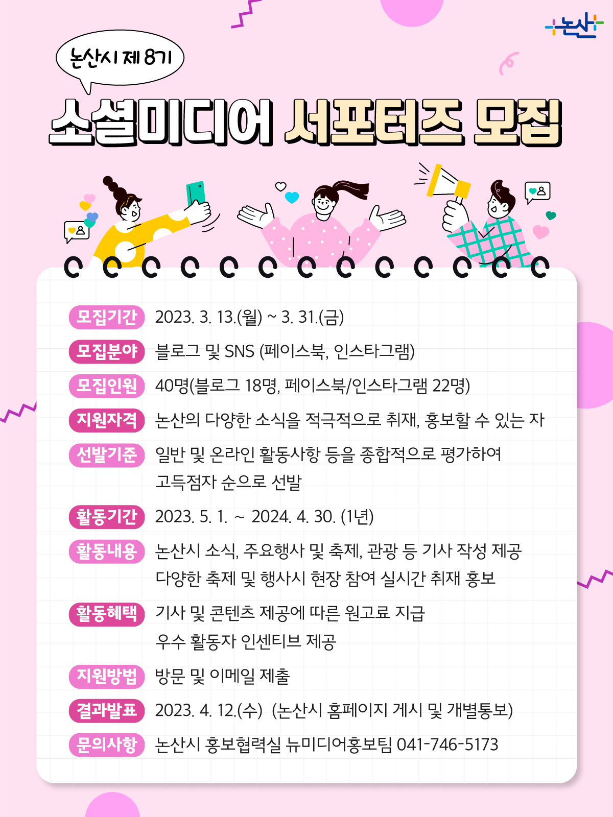 | 제목 | 논산시 제8기 서포터즈 모집 안내(~3.31) | ||||