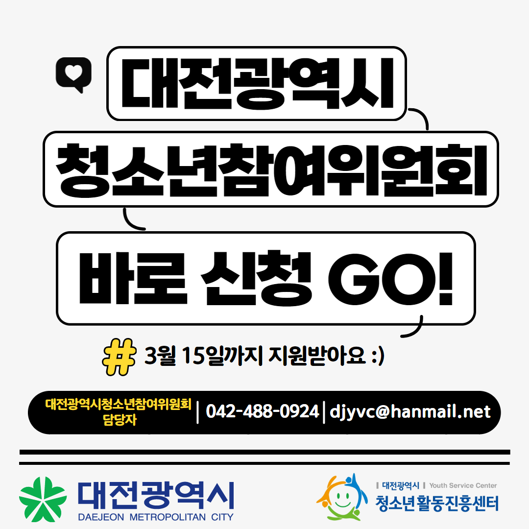 | 제목 | 2024년 대전광역시청소년참여위원회 위원 모집 알림 | ||||