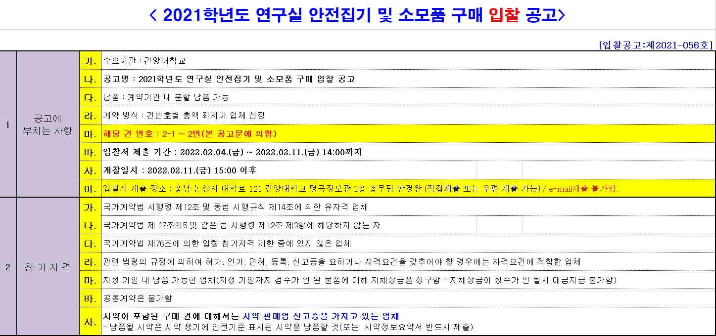 | 제목 | [2021-056]2021학년도 연구실 안전집기 및 소모품 구매 입찰 공고 | ||||