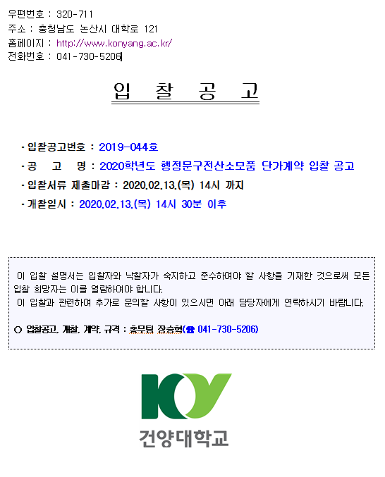 | 제목 | [2010-044호] 2020학년도 행정문구전산소모품 구매 단가계약 업체 선정 입찰 공고 | ||||