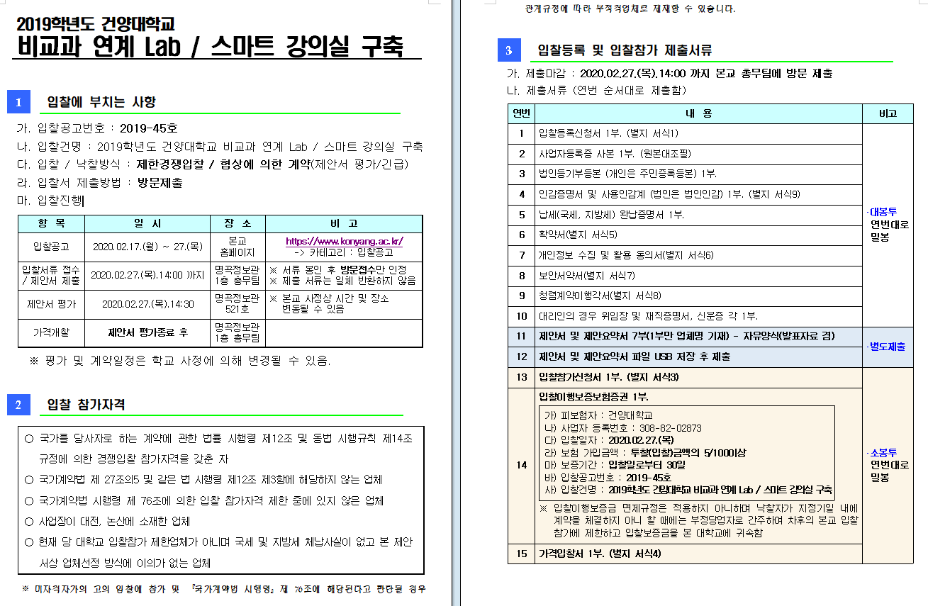(2019-045호)2019학년도 건양대학교 비교과 연계 Lab 스마트 강의실 구축 입찰 공고 세부내용 첨부서류 참조 |