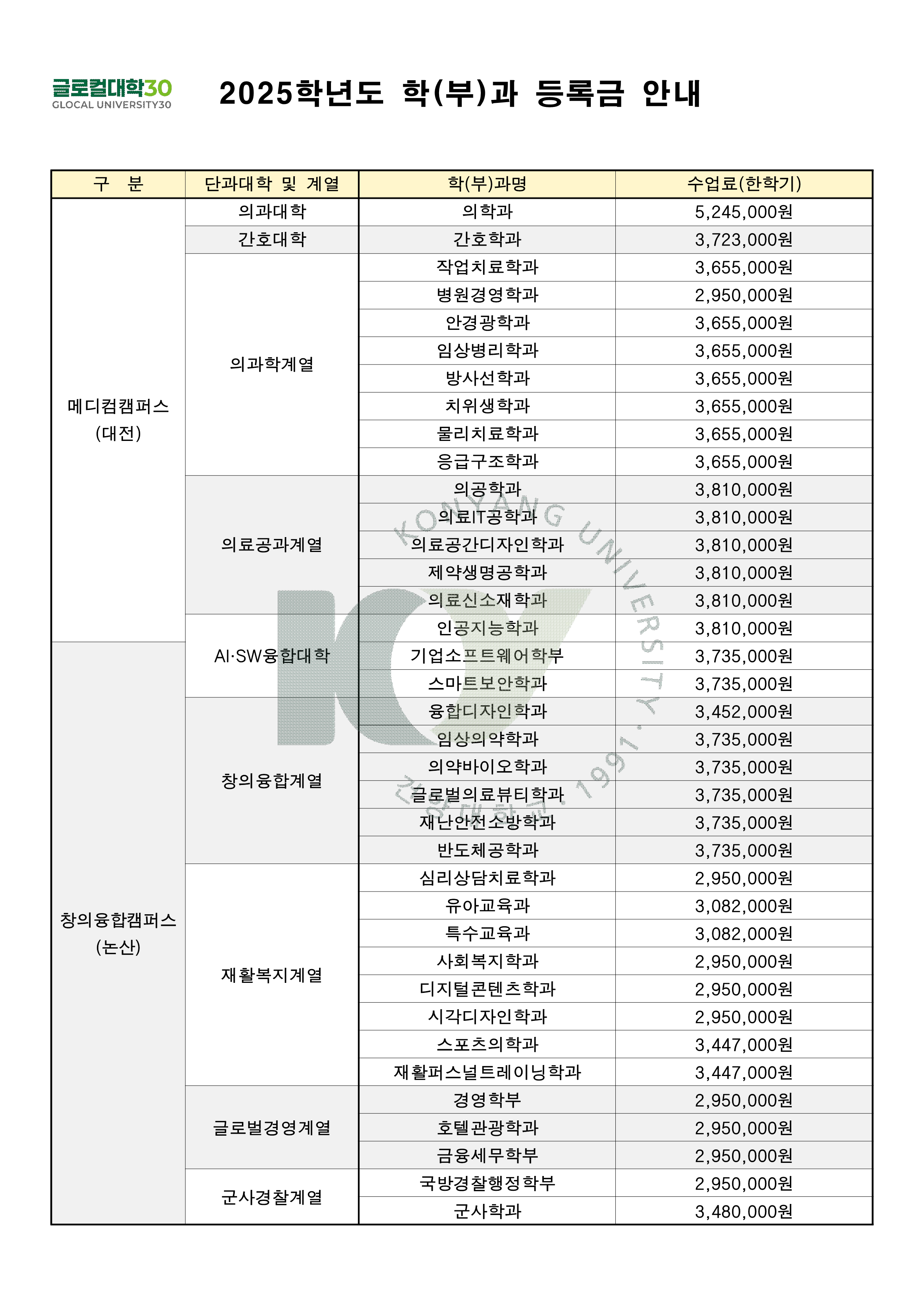 2025학년도 기준 등록금으로 안내드립니다.